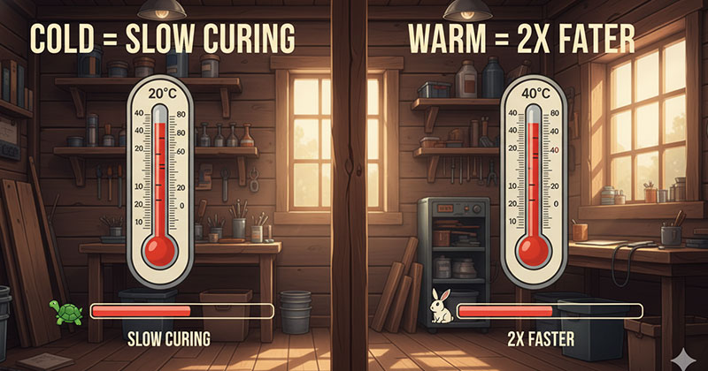 Nhiệt độ là biến số kiểm soát tốc độ đông cứng hiệu quả nhất. Epoxy thiết kế đông cứng ở 25°C thường có thể thi công và đông cứng ở 30–40°C với tốc độ cao hơn đáng kể. Nguyên tắc thực hành: mỗi 8–10°C tăng thêm rút ngắn thời gian đông cứng khoảng 50%.