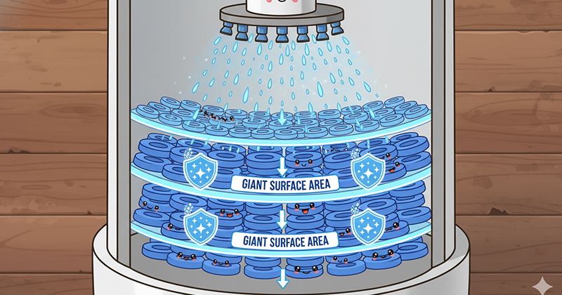 Thiết kế này giúp các hạt sương va chạm và ngưng tụ lại thành giọt lớn rồi rơi ngược trở lại bể chứa dung dịch phía dưới.