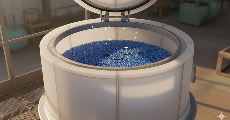 Khi dung dịch hấp thụ chảy xuống và khí thải bay lên, chúng sẽ va chạm và phản ứng hóa học ngay trên bề mặt của các hạt đệm nhựa này.