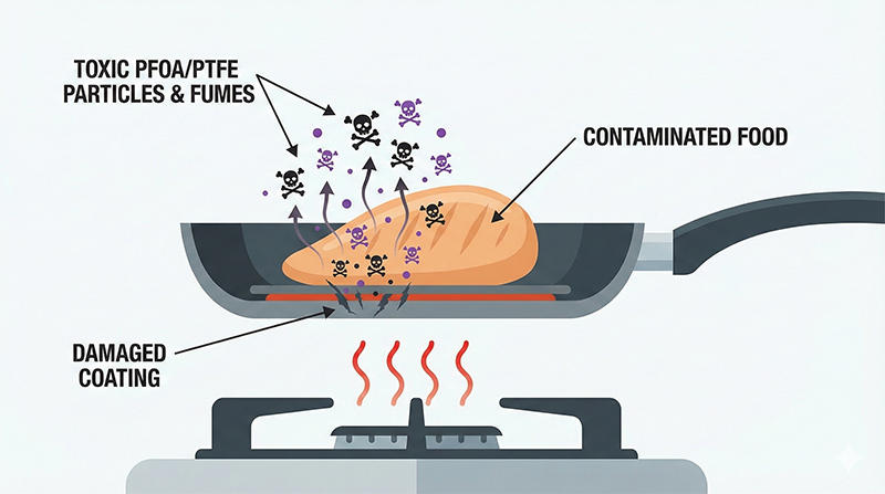 FDA: “Không lo ngại sức khỏe” – PTFE không hấp thụ qua ruột, đào thải qua phân 24-48h. Tuy nhiên vi nhựa tích lũy dài hạn chưa rõ, nguyên tắc phòng ngừa nên tránh. Nguy cơ thực: Kim loại lõi (nhôm, chì, cadmium) khi lớp bong tiếp xúc thức ăn axit.