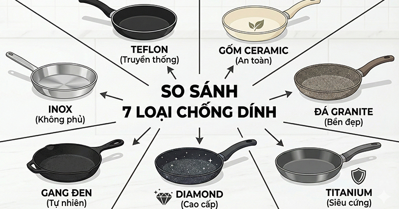 Budget <500k: Teflon PFOA-free (Tefal, Lock&Lock) bền 2-3 năm. Budget 500-1.200k: Ceramic/Granite (Elmich, Happycall) bền 4-6 năm an toàn hơn – khuyến nghị 80% gia đình. Budget >1.500k: Titanium/Inox (WMF, Fissler) bền 10+ năm.