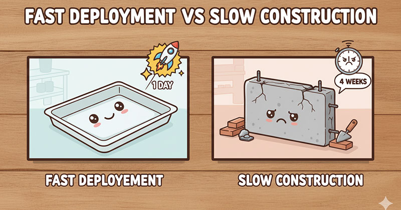 Gờ bê tông đòi hỏi quy trình thi công hoàn chỉnh: chuẩn bị mặt bằng, cốp pha, đổ bê tông, bảo dưỡng 14–28 ngày trước khi chịu tải, sau đó phủ lớp epoxy kháng hoá chất (thêm 3–7 ngày) và đóng rắn hoàn toàn (thêm 7 ngày). Toàn bộ khu vực thi công không sử dụng được trong 3–6 tuần. Với nhà máy đang vận hành, điều này đồng nghĩa với ngừng một phần sản xuất – chi phí cơ hội đáng kể.