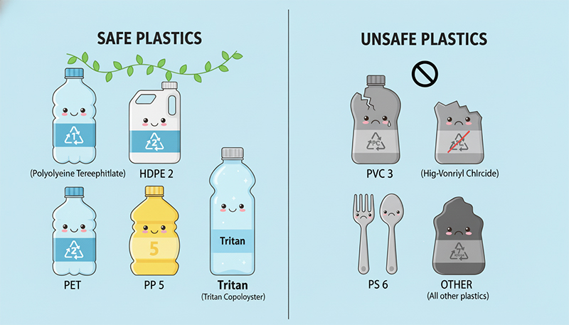 PP (số 5) và HDPE (số 2) là hai loại an toàn nhất, được FDA và Bộ Y tế Việt Nam khuyên dùng. PP chịu nhiệt cao hơn (135°C), HDPE an toàn hơn một chút nên dùng cho bình sữa trẻ em.