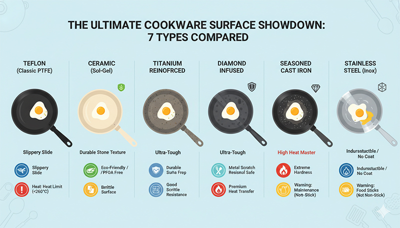 So sánh 7 lớp chống dính: Teflon, gốm Ceramic, đá Granite, Titanium, Diamond, gang đen, inox. An toàn, độ bền, giá. Chọn loại nào? 0918.710.622