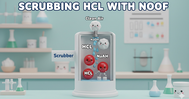 Cơ chế xử lý tối ưu: Scrubber ướt tháp hấp thụ dung dịch NaOH 5–10%. Phản ứng HCl + NaOH → NaCl + H2O xảy ra nhanh và gần như hoàn toàn – hiệu suất xử lý 95–99% đạt được với chiều cao đệm 1,5–2,5 m. Đây là khí dễ hòa tan nhất trong nước (hằng số Henry rất thấp), Scrubber ướt là lựa chọn tối ưu về hiệu suất và chi phí. Vật liệu tháp nhựa PP là tiêu chuẩn vì kháng HCl mọi nồng độ và NaOH bền vĩnh viễn.