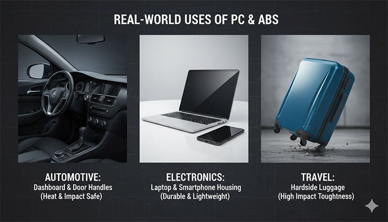 Ứng dụng điển hình của PC/ABS blend: vỏ laptop, vỏ điện thoại, nội thất ô tô (taplo, tấm ốp cửa), vỏ máy in, thiết bị y tế không tiệt trùng hơi nước và thiết bị điện tử tiêu dùng cao cấp.