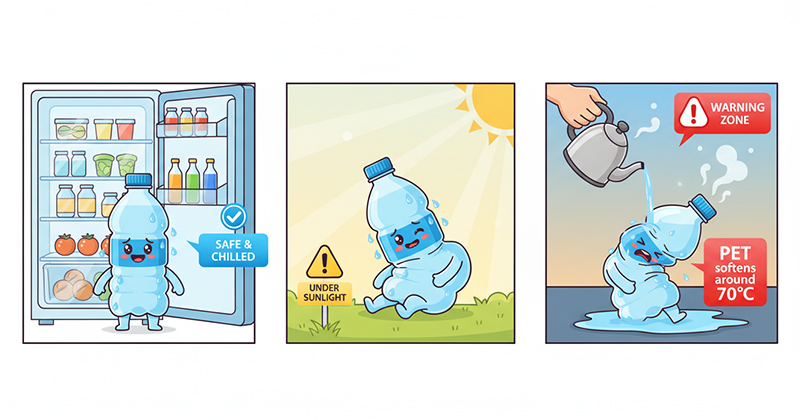 Kho bãi không có điều hòa trong mùa hè cũng có thể đạt nhiệt độ 50-60°C, gần giới hạn của PET. Cần có biện pháp thông gió và che chắn phù hợp.