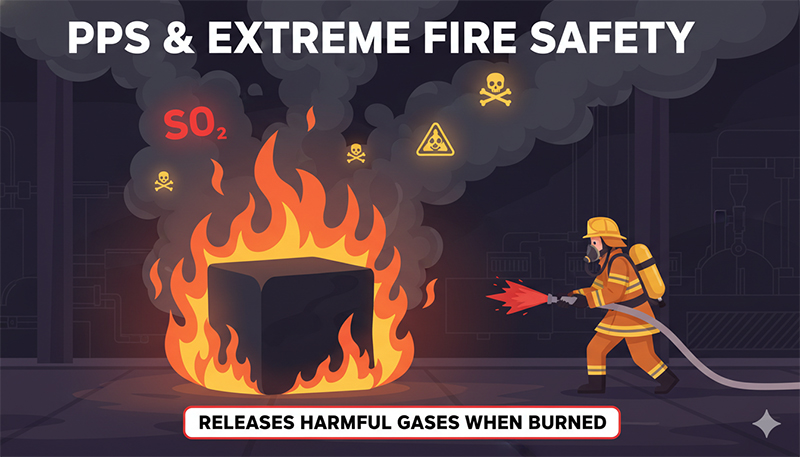 Khi PPS cháy ở nhiệt độ >600°C, phân hủy nhiệt sinh ra các khí độc: SO₂ (Sulfur dioxide), H₂S (Hydrogen sulfide), CO (Carbon monoxide), Benzen, toluene.