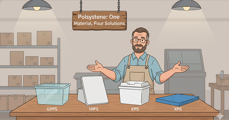 Nhìn vào cốc cà phê dùng một lần trắng mờ, tấm xốp lót đóng gói điện tử, hộp đựng sữa chua trong suốt ở siêu thị hay vỏ tủ lạnh màu trắng ngà – tất cả đều là PS (Polystyrene). Đây là một trong bốn loại nhựa được sản xuất nhiều nhất thế giới cùng với PE, PP và PVC, nhưng lại là loại nhựa có sự đa dạng về các dòng sản phẩm nhiều nhất: cùng một nền hóa học styrene, nhưng thay đổi cấu trúc vi mô tạo ra bốn loại hoàn toàn khác nhau về tính năng, từ trong suốt và cứng giòn (GPPS) đến đục và dai (HIPS), từ bọt xốp siêu nhẹ (EPS) đến tấm cách nhiệt cứng (XPS).