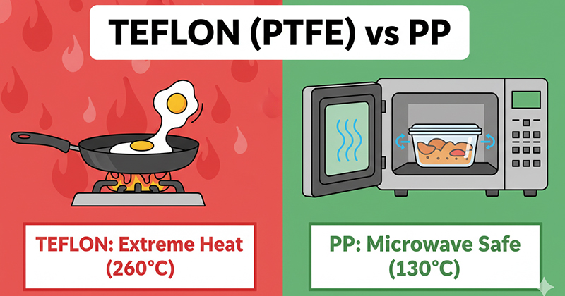 PP an toàn hơn – không độc ở mọi nhiệt độ làm việc, được FDA công nhận cho thực phẩm và y tế. Teflon an toàn khi <260°C, nhưng cực kỳ nguy hiểm khi >260°C do giải phóng khói HF, COF₂ độc hại gây sốt khói polymer và tổn thương phổi.
