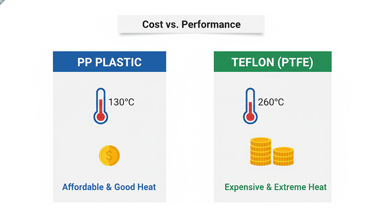 Chênh lệch: Teflon đắt hơn PP 20-50 lần về nguyên liệu. Đây là rào cản lớn nhất khi cân nhắc sử dụng Teflon.