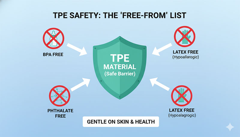 Có – TPE là vật liệu được khuyến nghị cao nhất cho đồ chơi và đồ dùng trẻ em trong các hệ thống tiêu chuẩn quốc tế hiện hành. Không chứa BPA, không chứa Phthalates, không gây kích ứng da, tỷ lệ dị ứng chỉ 0,1% – thấp hơn 80–120 lần so với cao su tự nhiên.
