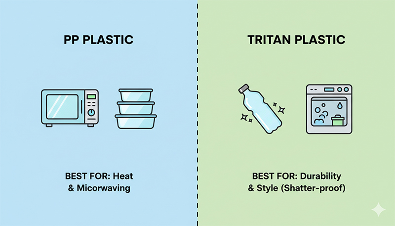 Tritan đẹp hơn, bền hơn, không bám mùi nhưng giá cao gấp 3-5 lần. PP chịu nhiệt tốt hơn, giá rẻ.