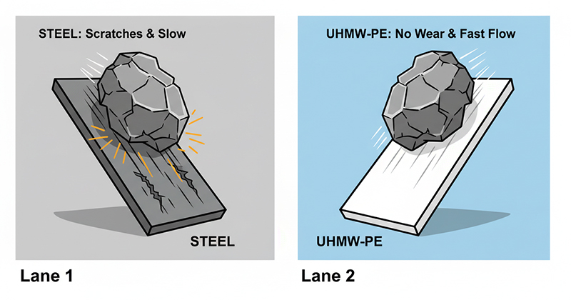 Bề mặt trượt của UHMW PE giúp ngăn chặn vật liệu dính tắc trong quá trình vận chuyển, giảm thời gian dừng máy, tăng năng suất.