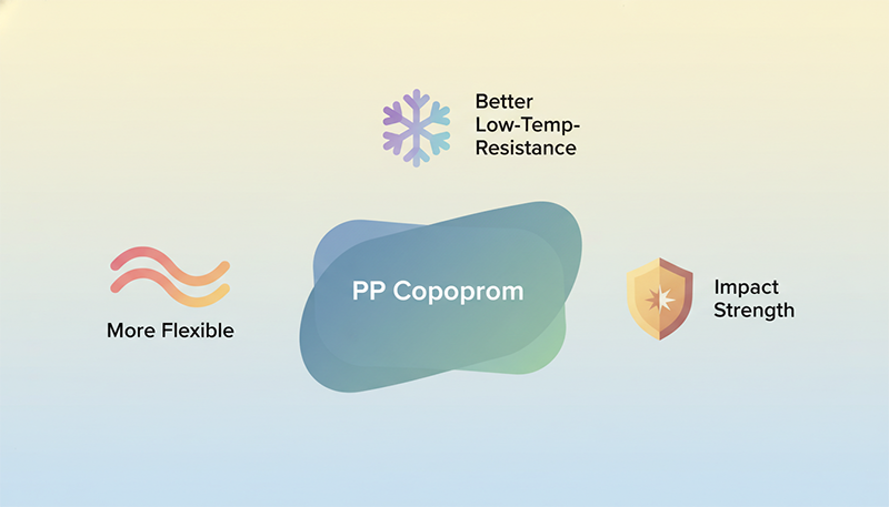 5 ưu điểm so với Homopolymer: Chống va đập cao hơn nhiều (2-10 lần) – giảm tỷ lệ vỡ hỏng sản phẩm. Trong suốt hơn (Random) – thẩm mỹ đẹp, nhìn thấy bên trong. Mềm mại, đàn hồi hơn – cảm giác tốt hơn khi sử dụng. Chịu nhiệt độ thấp tốt hơn – không giòn ở -20°C. Đa dạng hóa ứng dụng – mở rộng phạm vi sử dụng PP.