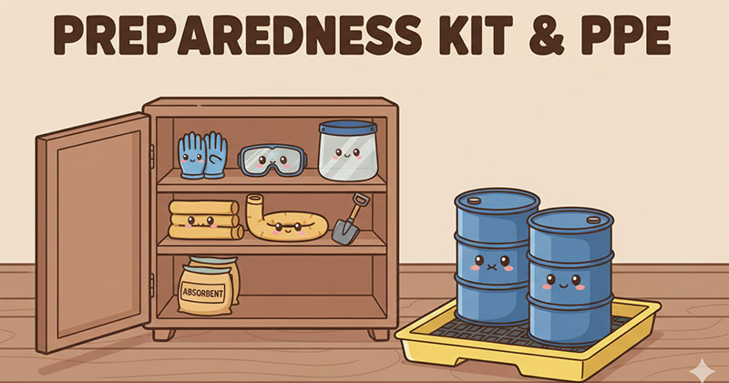 - Ba điều kiện tiên quyết: spill kit sẵn sàng, PPE đủ và sẵn sàng lấy, nhân viên được tập huấn thực hành ít nhất một lần mỗi năm.