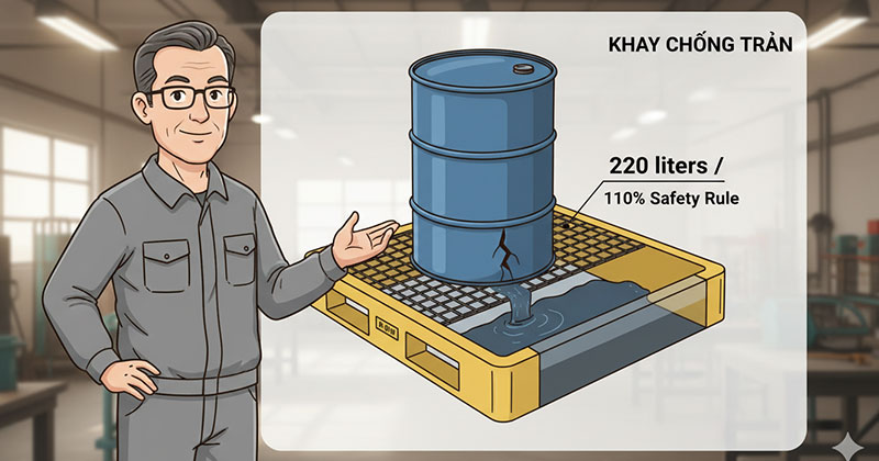 Tiêu chuẩn khay chống tràn hóa chất là gì? Phân tích đầy đủ quy tắc 110%, EPA 40 CFR 264.175, OSHA 29 CFR 1910.106, QCVN Việt Nam, bảng chọn vật liệu khay theo hóa chất và hướng dẫn lắp đặt đúng chuẩn.
