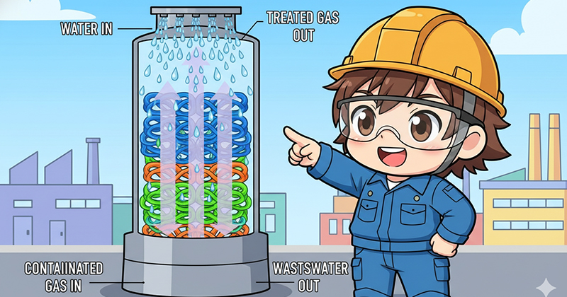 Tháp scrubber loại bỏ NH3 và H2S dựa trên nguyên lý hấp thụ ướt (wet scrubbing): dòng khí thải được tiếp xúc ngược chiều với dung dịch hấp thụ phun từ trên xuống. Diện tích tiếp xúc khí-lỏng được tối đa hóa nhờ vật liệu đệm (packing media) bên trong tháp, thường là vật liệu nhựa PP dạng Pall ring, Raschig ring hoặc tấm sóng.