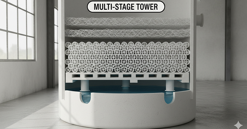 Độ dày của lớp đệm này thường dao động từ 1000mm đến 2000mm tùy thuộc vào tải lượng ô nhiễm thiết kế ban đầu. Tháp đạt hiệu suất tách lọc lên đến trên 99% theo chuẩn QCVN nhờ sự kết hợp giữa phản ứng hóa học nhanh và diện tích tiếp xúc lớn.