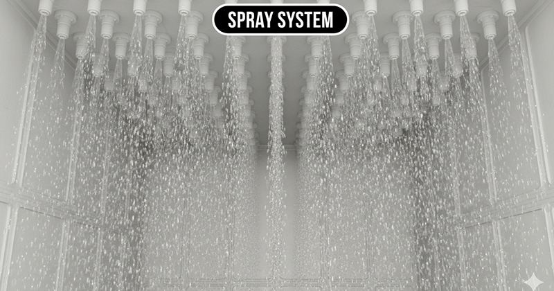 Các đầu vòi phun sương bố trí trên đỉnh có nhiệm vụ xé nhỏ dung dịch thành hàng triệu hạt sương siêu vi để bao phủ vật liệu đệm. Kiểu béc phun hình nón đặc hoặc xoắn ốc được ưu tiên sử dụng nhờ khả năng chống tắc nghẽn tốt.