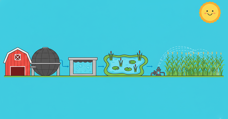 Nước sau xử lý đạt QCVN 62-MT:2016/BTNMT cột B hoặc cột A tùy yêu cầu nguồn tiếp nhận. Có thể tái sử dụng tưới cây trồng, rửa chuồng trại (nếu khử trùng tốt), nuôi cá nước ngọt (cá trắm cỏ, rô phi), tiết kiệm 50–70% nước sạch, giảm chi phí nước 5–10 triệu/tháng cho trại lớn.