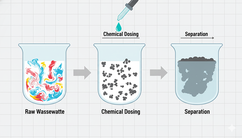 Nước thải sau khi qua song chắn rác sẽ được đưa vào bể điều hòa. Tại bể phản ứng, hóa chất keo tụ (như PAC) và chất trợ keo tụ (Polymer) được châm vào. Mục đích là phá vỡ trạng thái bền của các hạt keo sơn, khiến chúng kết dính lại với nhau thành các bông cặn lớn hơn.